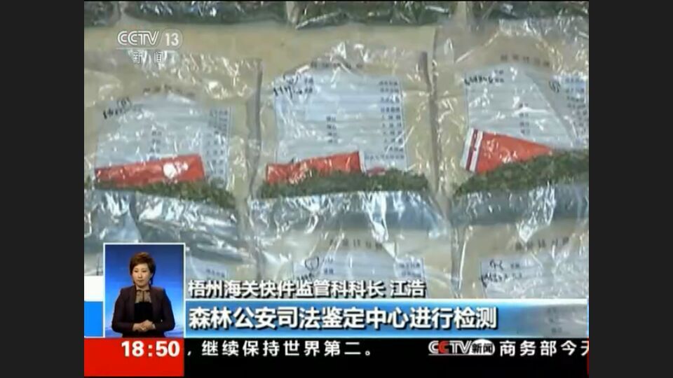 中央电视台新闻频道(CCTV-13)于4月19日晚的《共同关注》节目中报道:广西梧州海关破获了一起通过国际快递渠道走私毒品的案件,查获涉嫌走私的新型毒品恰特草近8千克,抓获犯罪嫌疑人一名。在案件侦破过程中,国家林业局森林公安司法鉴定中心受广西梧州海关委托,参与案件侦破过程中的恰特草鉴定工作。