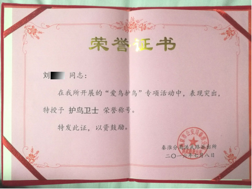 我院刑事科学技术系13级学警刘同学在学年论文中完成《南京市花鸟市场贩卖鸟类现状调查》后,继续在校大学生创新项目《南京野生鸟类买卖供需链现状调研》中开展后续工作。在学年论文和大创项目的连续半年多的实地调研中,发现南京市花鸟市场野生鸟类贩卖存在严重非法出售珍贵濒危野生动物的问题后,与秦淮分局洪武路派出所、南京市玄武公安分局食药环犯罪侦查大队进行对接,提供调研材料,并参与到南京市公安分局食药环侦查大队的实习中去。刘同学同学在实习中参与了既“南京播放录音诱捕野鸟“鸟王”案”之后牵出的“4.22孙xx等人非法狩猎案”。在工作中获得秦淮分局“护鸟卫士”荣誉称号,并被南京市玄武公安分局评为优秀实习生。